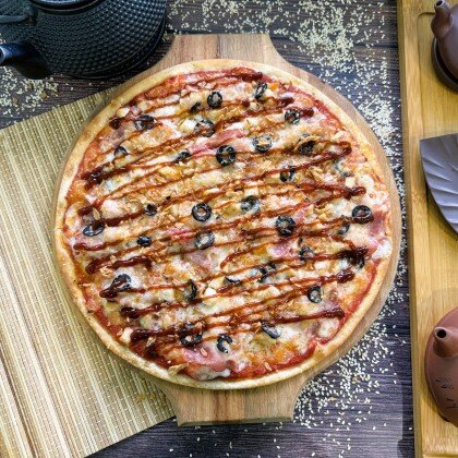 Соус белый, сыр моцарелла, курица запеченная, шампиньоны.