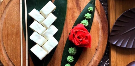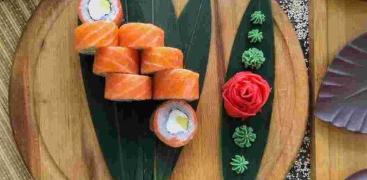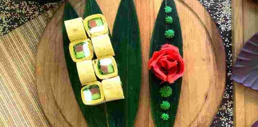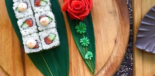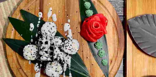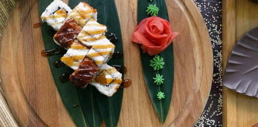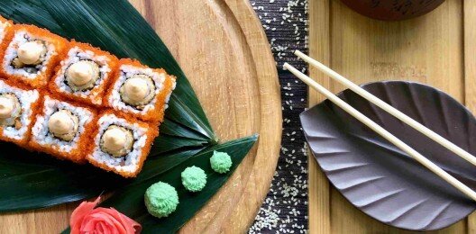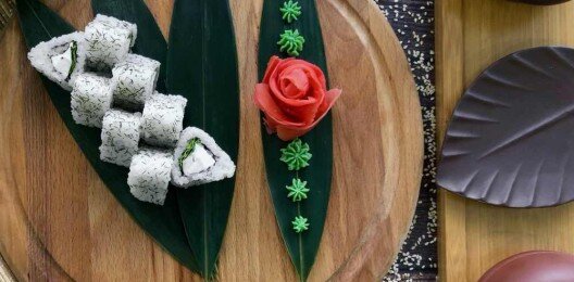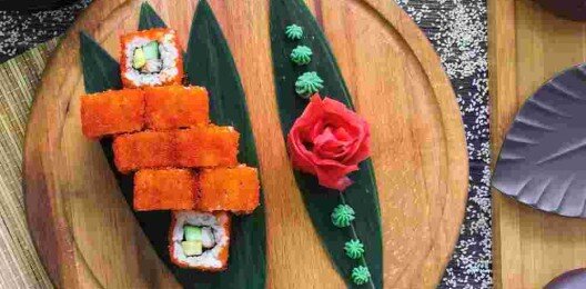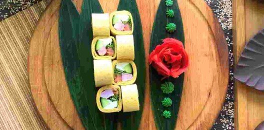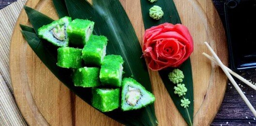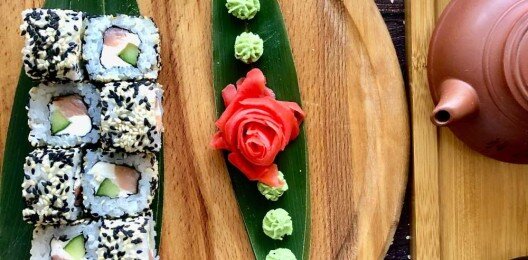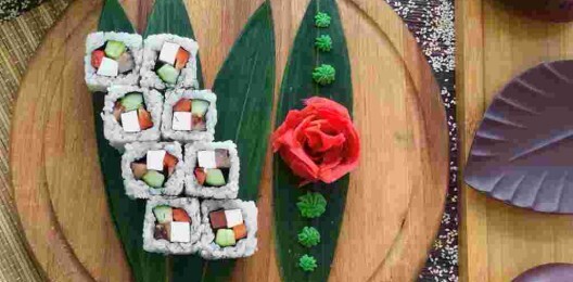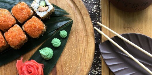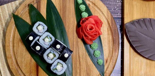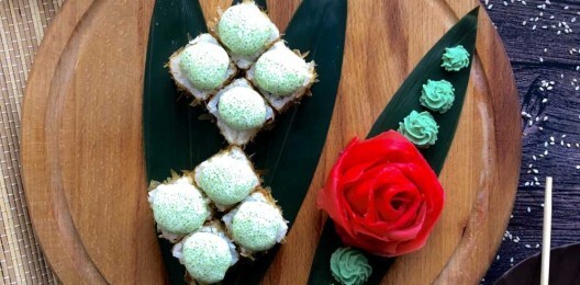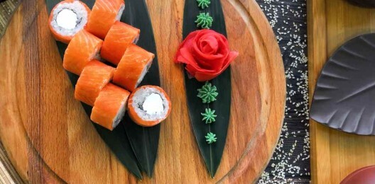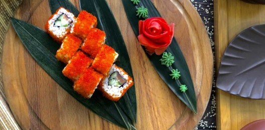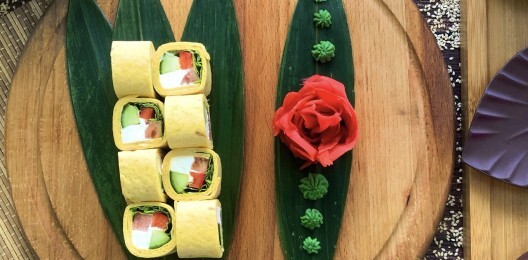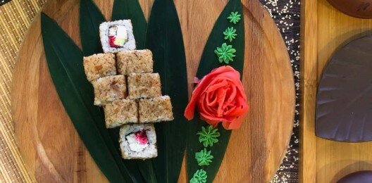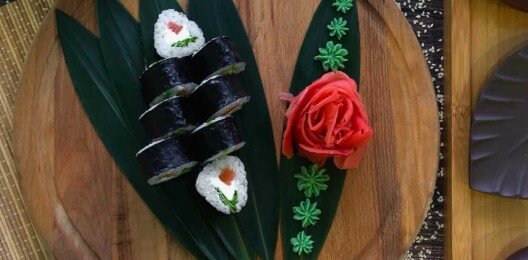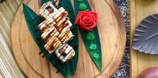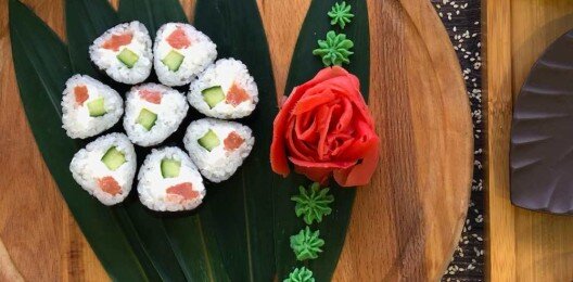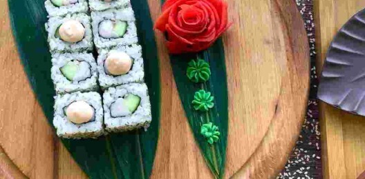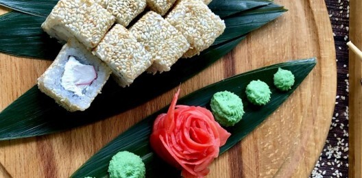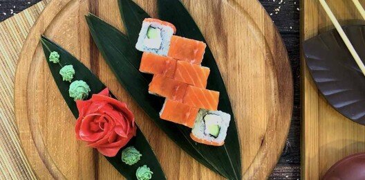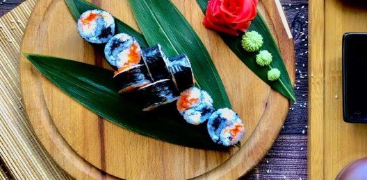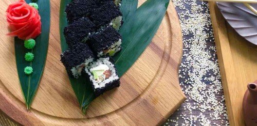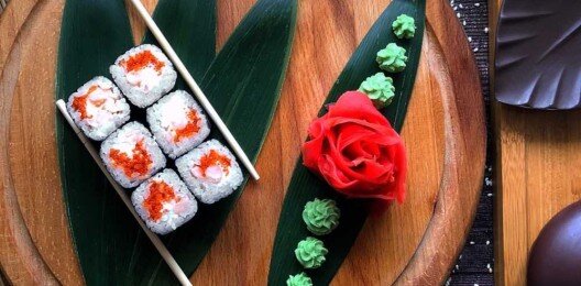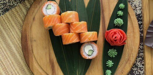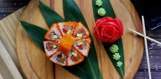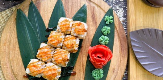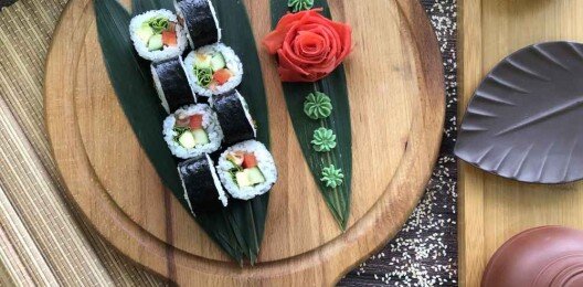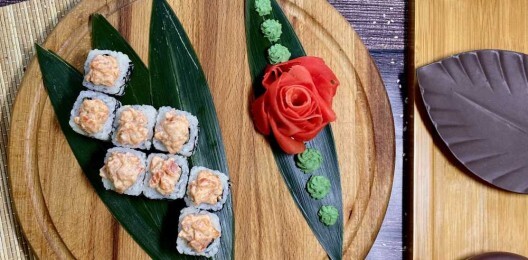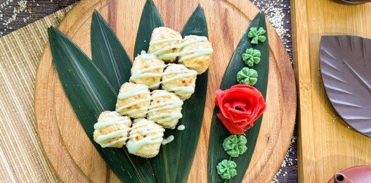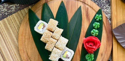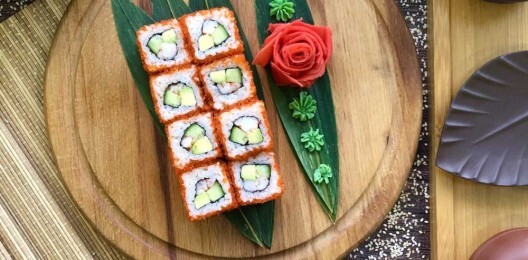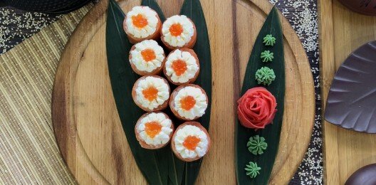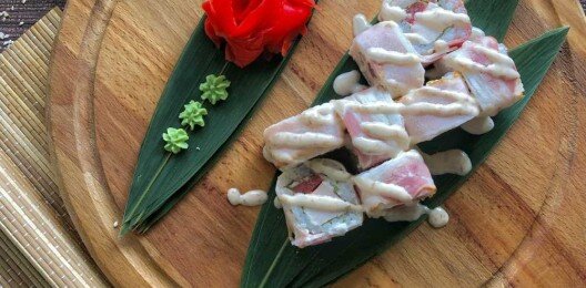 8 шт. Рис, нори, курица копчёная, плавленный сыр, укроп, шампиньоны, огурец, майонез.