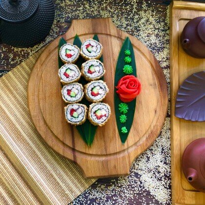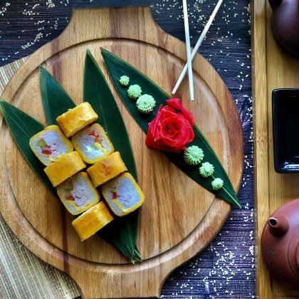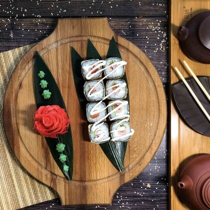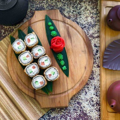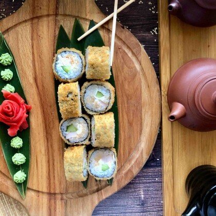 8 шт. Рис, нори, сыр сливочный, угорь, икра тобико, авокадо, панировочные сухари, кляр, соус терияки.